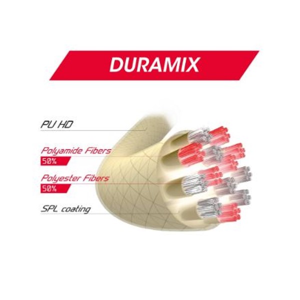 Die Duramix-Saite ist die erste Saite, die einen Mix aus Polyester- und Polyamidfasern aufweist, die mit geschmolzenem Polyurethan imprägniert sind. Diese einzigartige Konfiguration bietet ein echtes Plus an Kontrolle bei gleichzeitiger Beibehaltung eines guten Komfortniveaus.